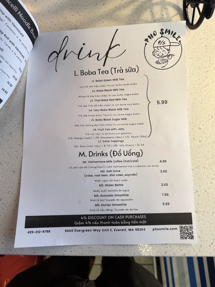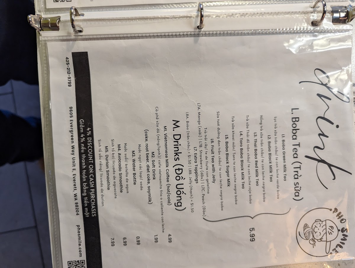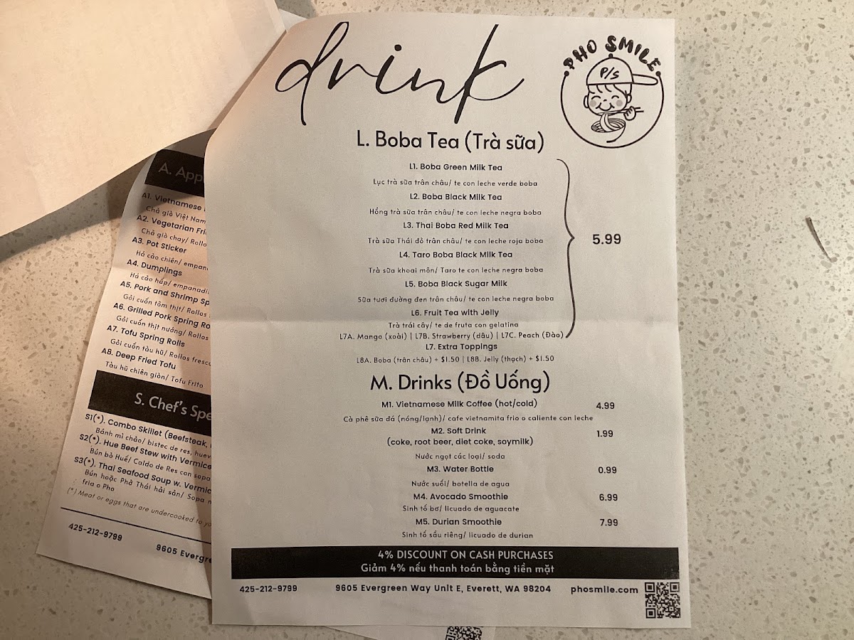 Pho Smile offers a wide-ranging menu that caters to various tastes, making it a great destination for anyone craving authentic Vietnamese cuisine. For appetizers, you can start with Vietnamese Fried Egg Rolls or Pot Stickers, both rich in flavor. The Beef Stew In Pho and Beef Stew In With Baguette stand out in the Beef Stew section, offering hearty and comforting options. For rice dishes, the Grilled Beef Short Ribs On Steam Rice and Shaking Fried Beef On Steam Rice are popular choices, along with options like Grilled Shrimp On Steam Rice and Grilled Chicken On Steam Rice. The Vietnamese Pho section is a highlight, with classics like Beef Ball, Brisket & Rare Pho and Chicken Pho, ensuring there's something for every pho lover. If you're in the mood for a sandwich, Pho Smile's Grilled Pork Sandwich and Tofu Sandwich are among the favorites. The Grilled Shrimp With Vermicelli and Grilled Pork And Egg Roll With Vermicelli are great picks for noodle bowls, while the stir fry noodles, such as Chow Mein With Chicken and Chow Mein With Beef, offer a satisfying meal. For something more unique, the Hue Beef Stew With Vermicelli and Thai Seafood Soup With Vermicelli make for an exciting meal choice. To wash it all down, Pho Smile serves a variety of refreshing Boba Tea, including Boba Green Milk Tea and Taro Boba Milk Tea, along with classic drinks like Vietnamese Milk Coffee. Whether you're looking for a filling pho or a sweet boba, Pho Smile has a diverse menu that delivers on both taste and variety.