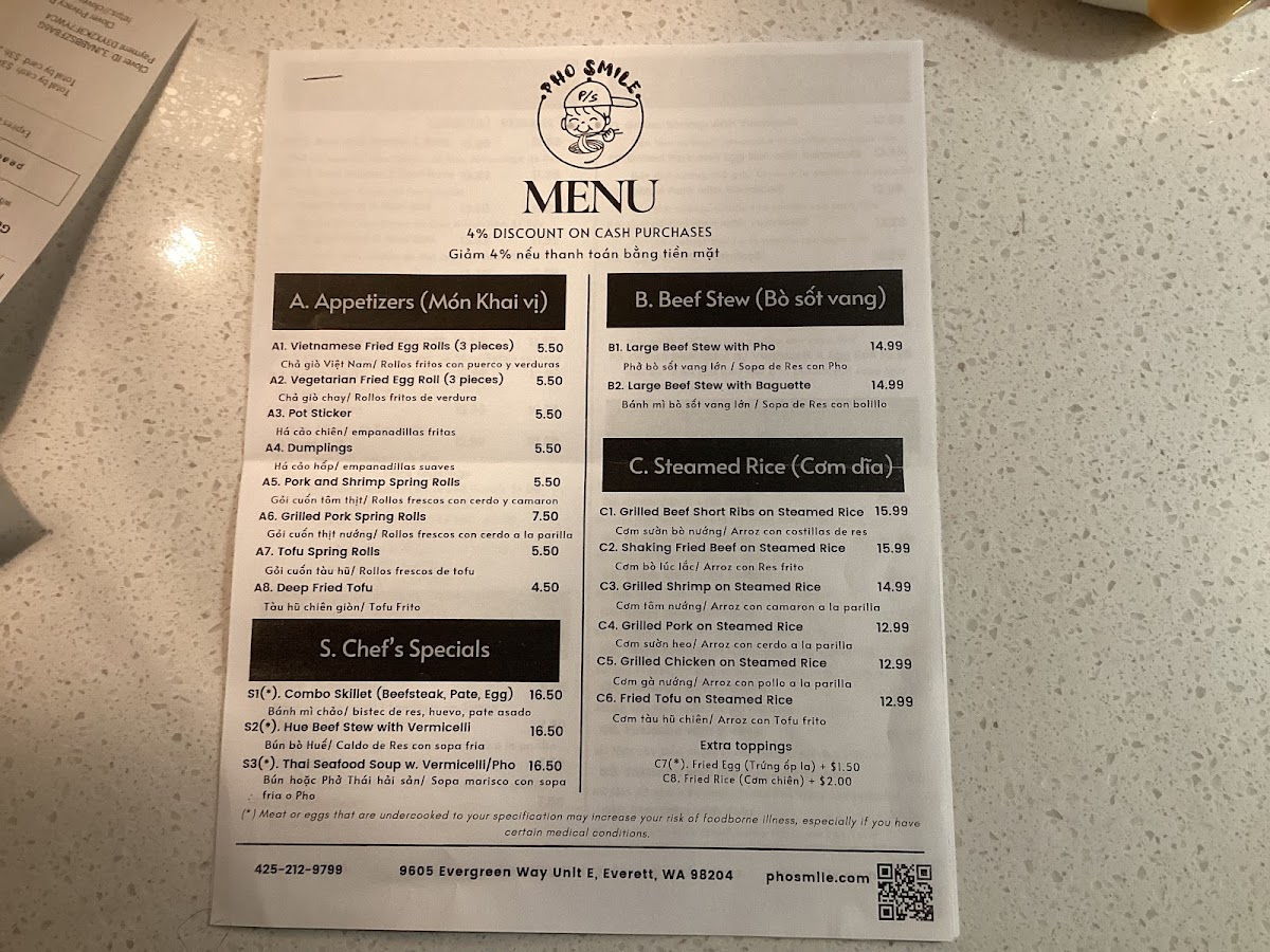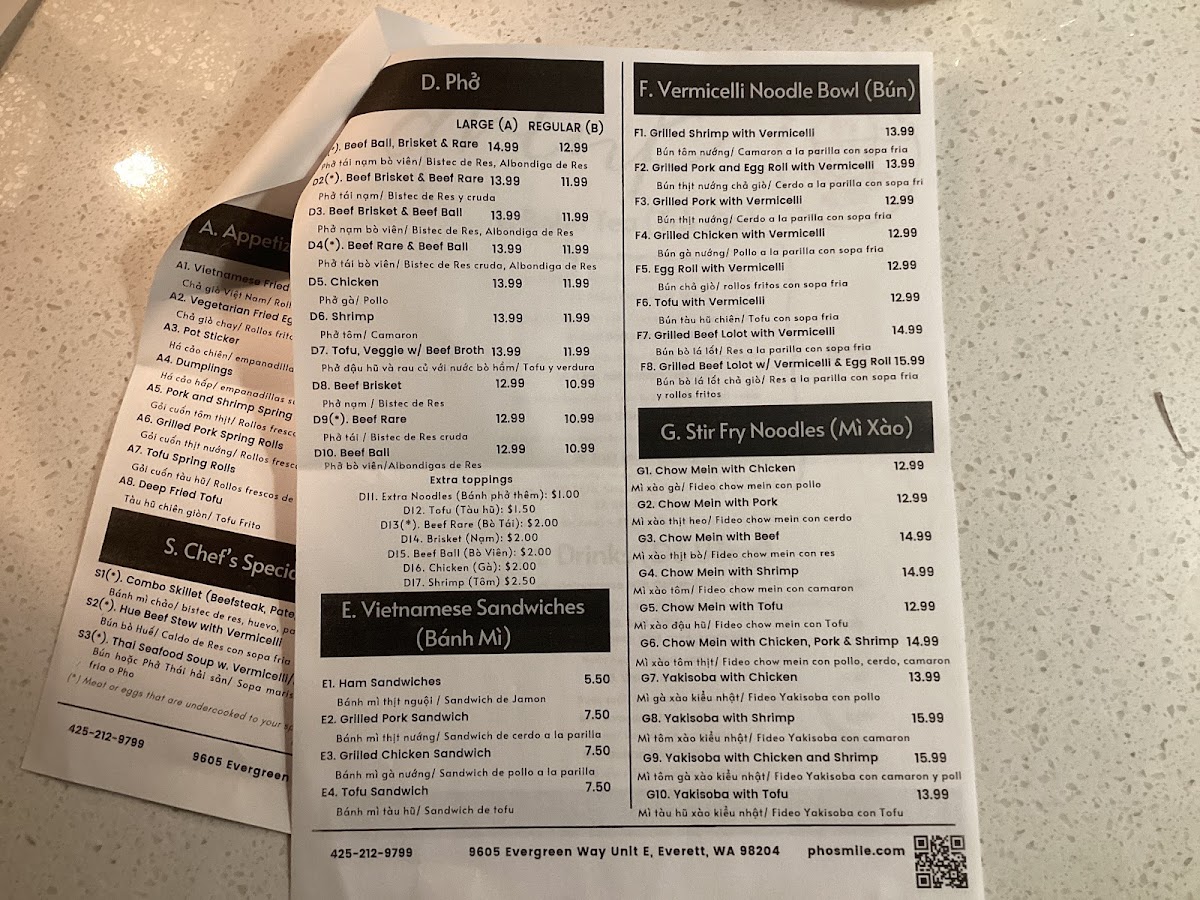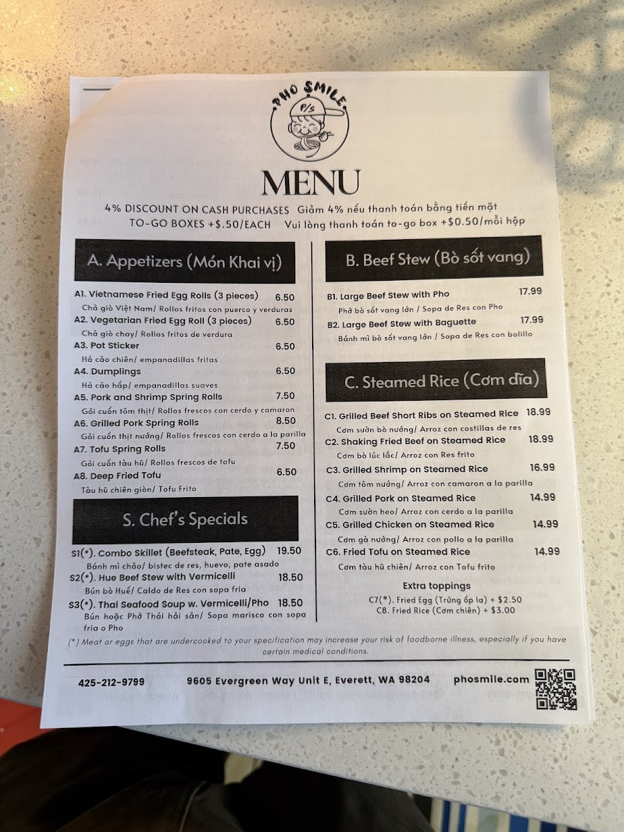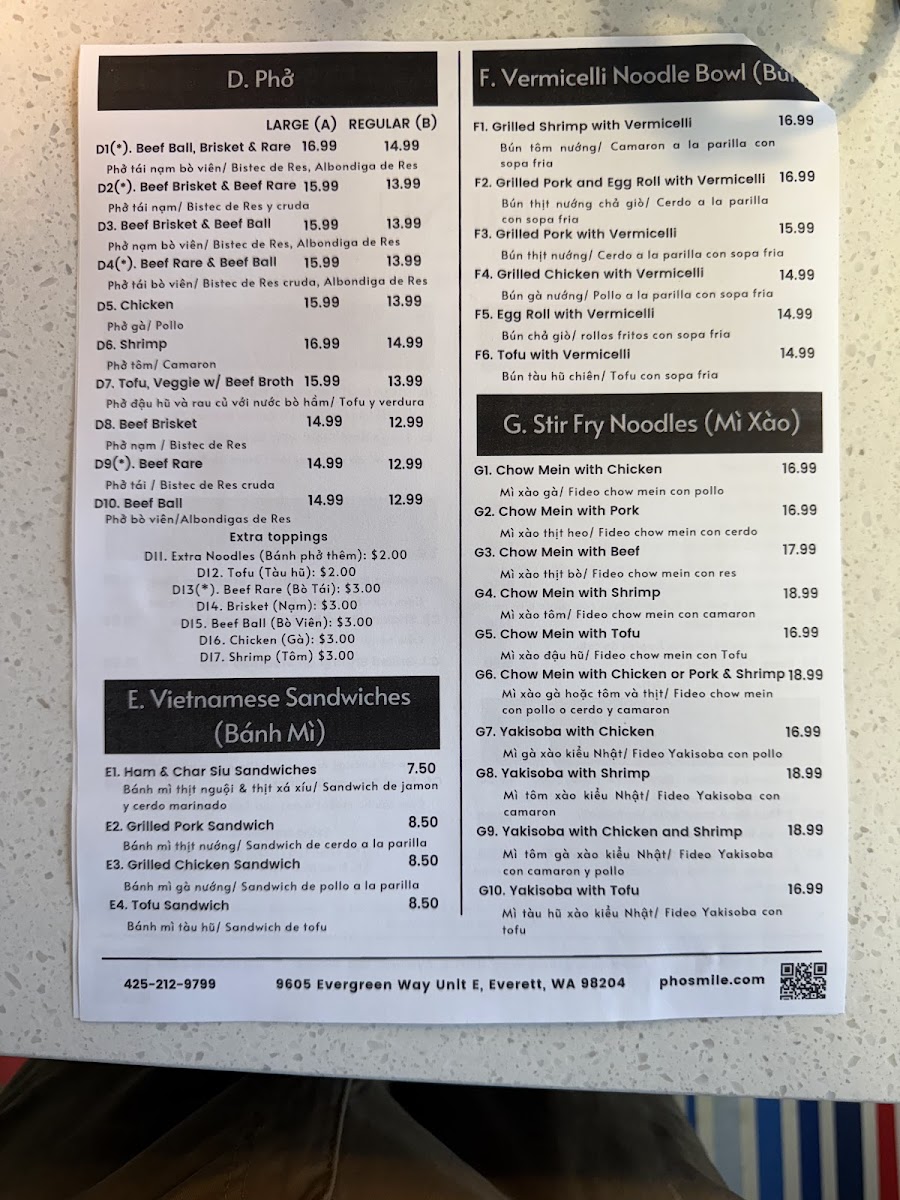 Pho Smile offers a wide-ranging menu that caters to various tastes, making it a great destination for anyone craving authentic Vietnamese cuisine. For appetizers, you can start with Vietnamese Fried Egg Rolls or Pot Stickers, both rich in flavor. The Beef Stew In Pho and Beef Stew In With Baguette stand out in the Beef Stew section, offering hearty and comforting options. For rice dishes, the Grilled Beef Short Ribs On Steam Rice and Shaking Fried Beef On Steam Rice are popular choices, along with options like Grilled Shrimp On Steam Rice and Grilled Chicken On Steam Rice. The Vietnamese Pho section is a highlight, with classics like Beef Ball, Brisket & Rare Pho and Chicken Pho, ensuring there's something for every pho lover. If you're in the mood for a sandwich, Pho Smile's Grilled Pork Sandwich and Tofu Sandwich are among the favorites. The Grilled Shrimp With Vermicelli and Grilled Pork And Egg Roll With Vermicelli are great picks for noodle bowls, while the stir fry noodles, such as Chow Mein With Chicken and Chow Mein With Beef, offer a satisfying meal. For something more unique, the Hue Beef Stew With Vermicelli and Thai Seafood Soup With Vermicelli make for an exciting meal choice. To wash it all down, Pho Smile serves a variety of refreshing Boba Tea, including Boba Green Milk Tea and Taro Boba Milk Tea, along with classic drinks like Vietnamese Milk Coffee. Whether you're looking for a filling pho or a sweet boba, Pho Smile has a diverse menu that delivers on both taste and variety.